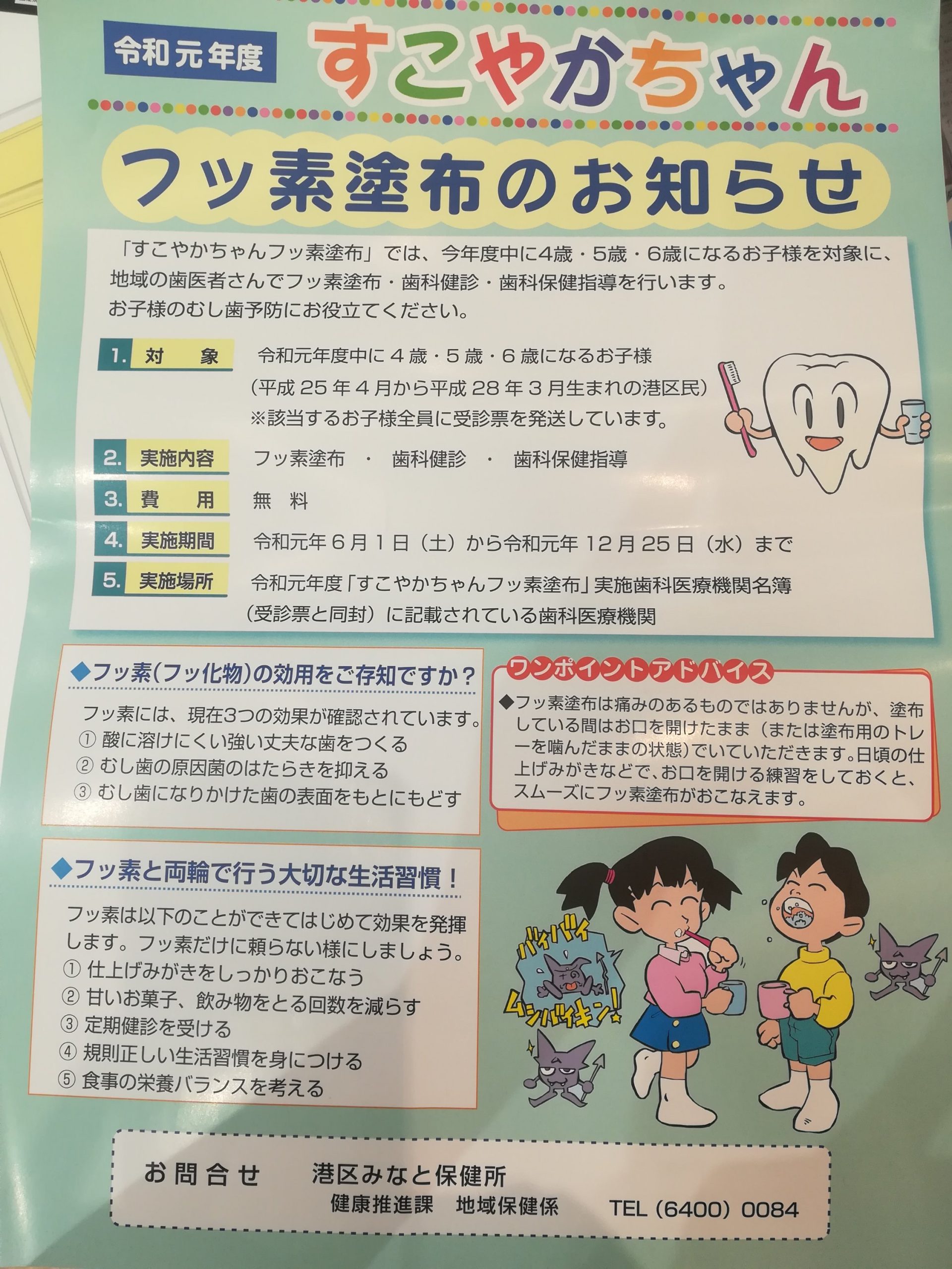 港区お口の健診と、すこやかちゃんフッ素塗布を行っております。